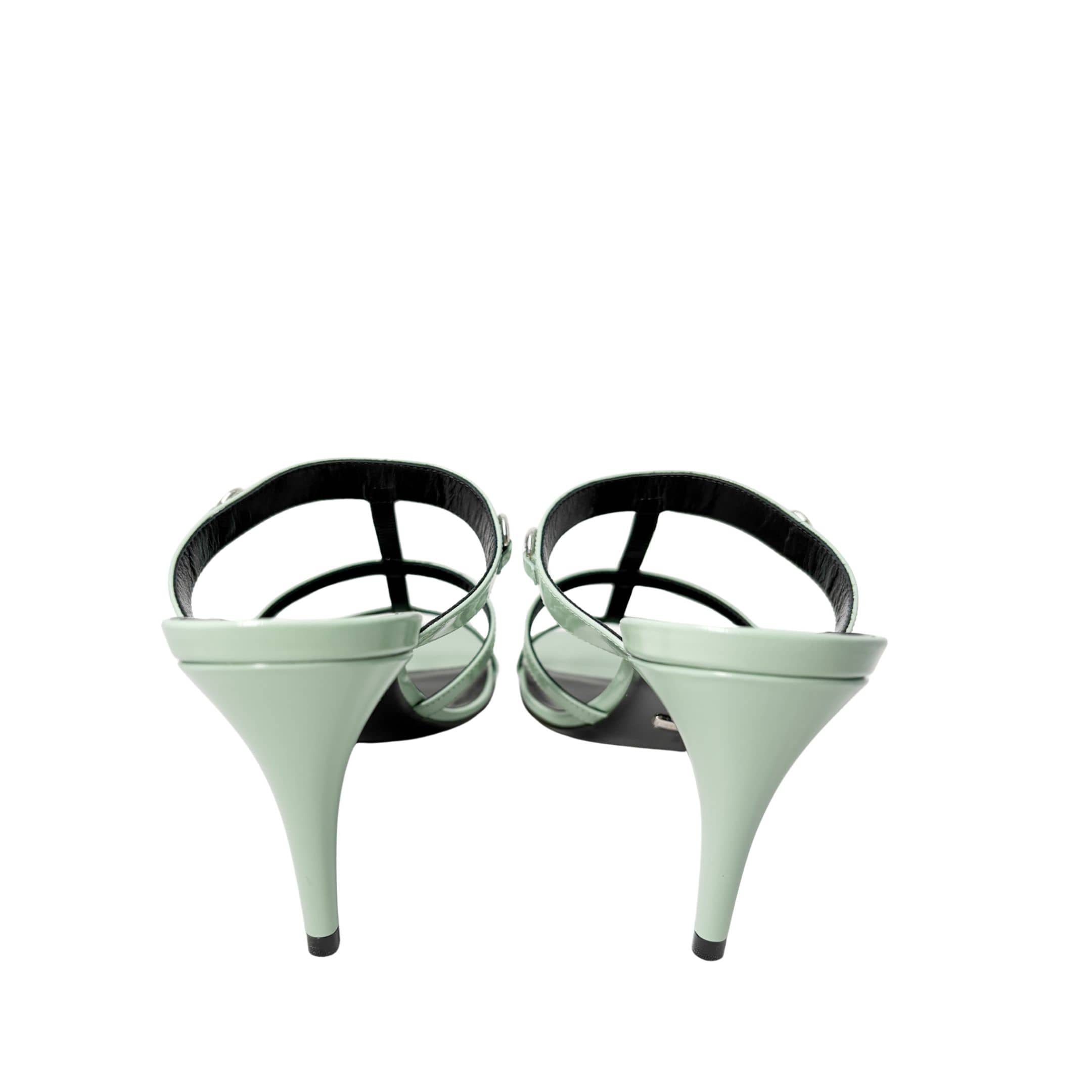 Step into elevated elegance with the Gucci Regent Heeled Sandals in striking Pacific Green. Crafted in glossy leather with sculptural lines, this open-toe silhouette features a stiletto heel and slim straps for secure, graceful wear. Finished with subtle Gucci detailing, the Regent sandal adds a bold pop of color to evening wear or an unexpected twist to daytime tailoring.