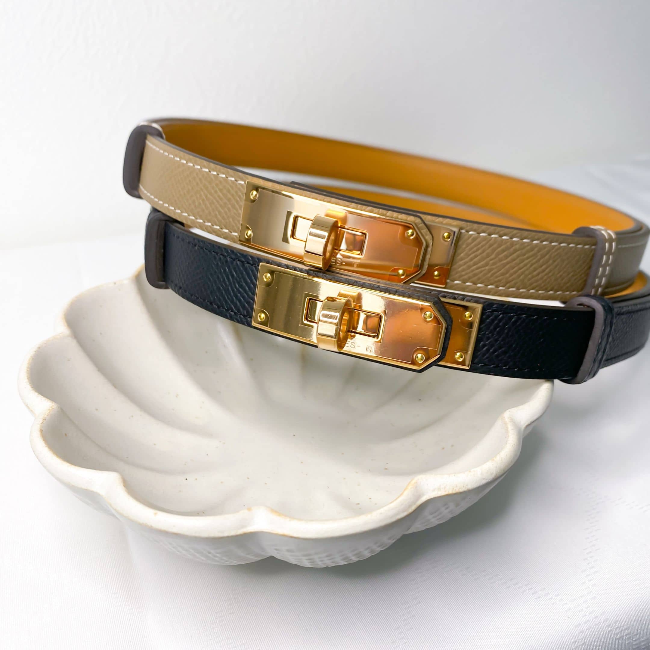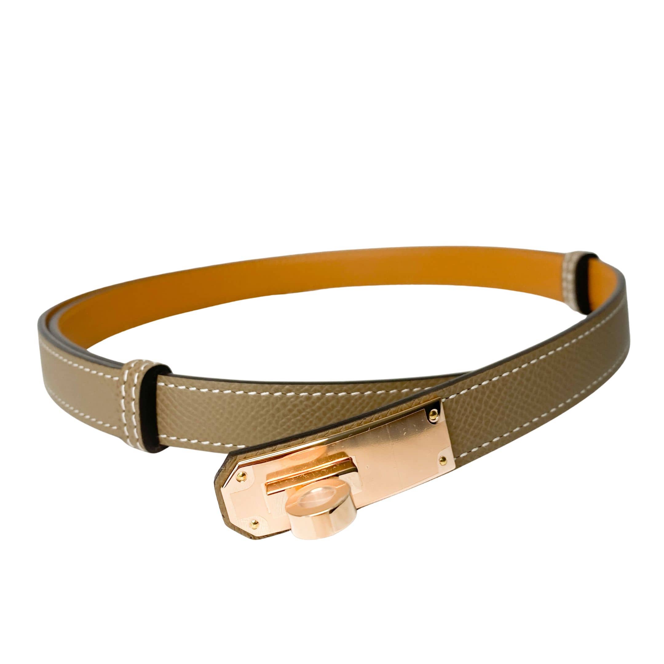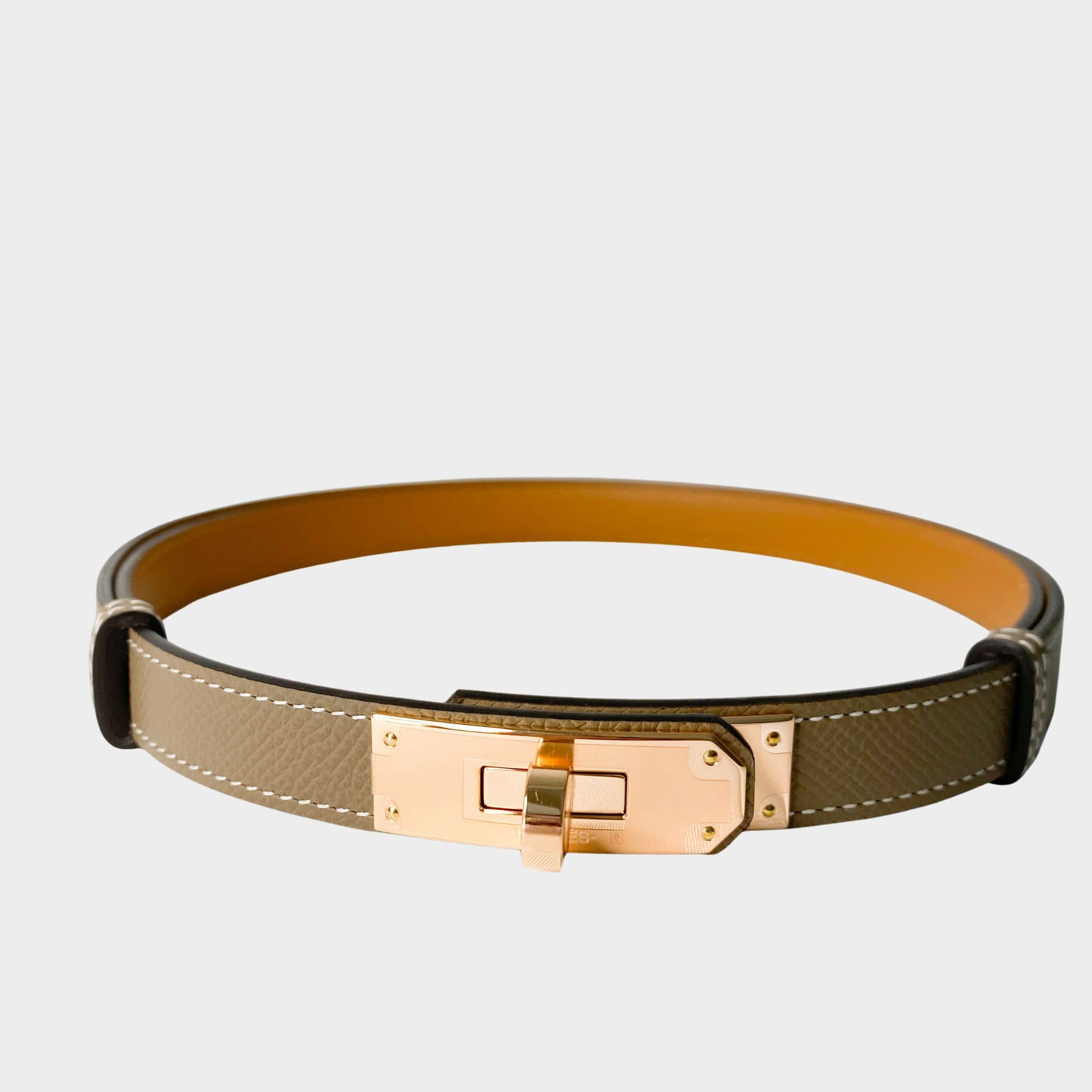 The Hermès Kelly belt in Etoupe with rose gold hardware blends modern versatility with classic luxury. Etoupe, Hermès’ signature taupe-grey shade, pairs seamlessly with both neutral and colorful wardrobes, making this Hermès belt a true everyday essential. Finished with the iconic Kelly turn-lock buckle in radiant rose gold, the design reflects the elegance of the celebrated Hermès Kelly bag. Adjustable for the perfect fit, this piece offers endless styling potential, wear it with dresses, blazers, or high-waisted trousers for an effortlessly chic finish.