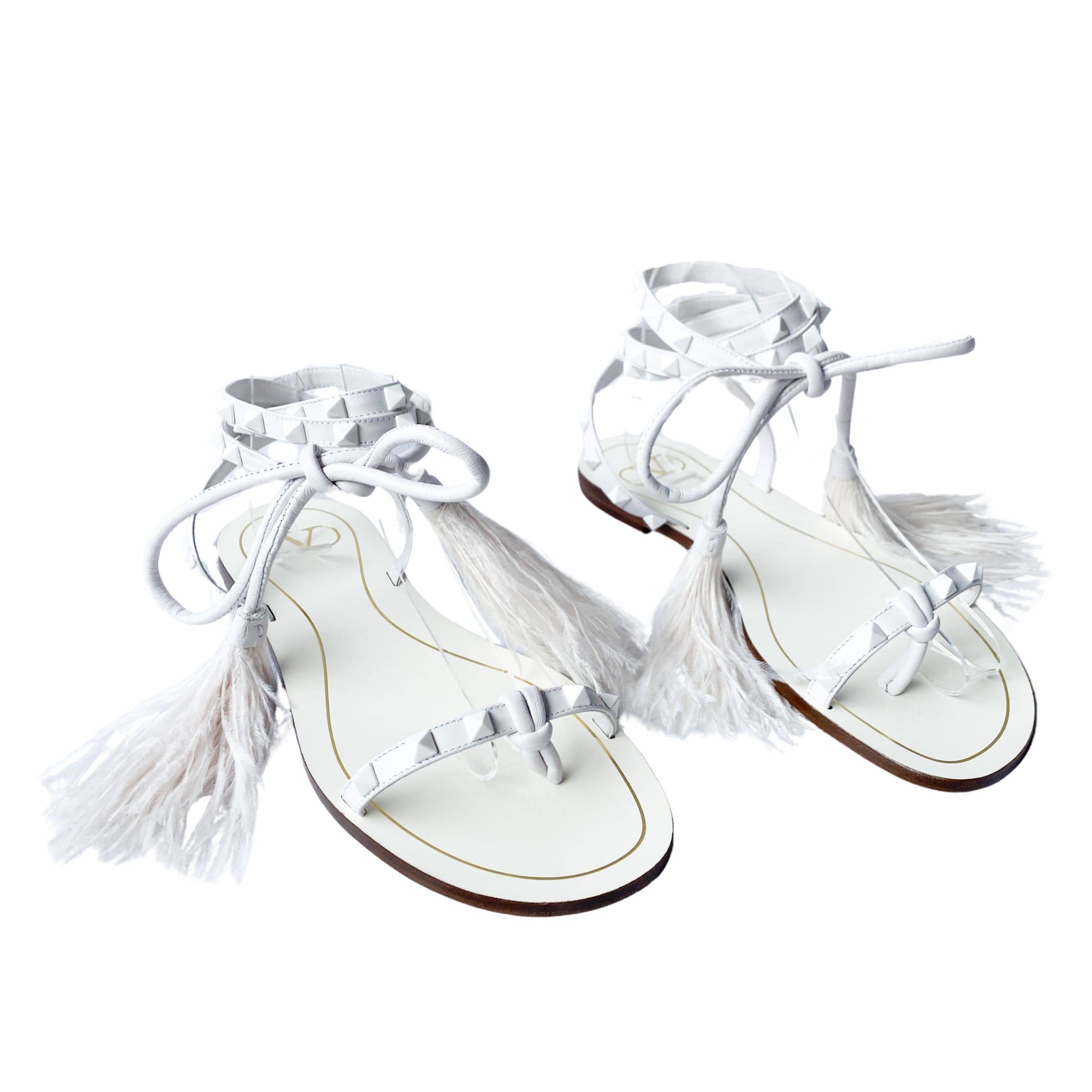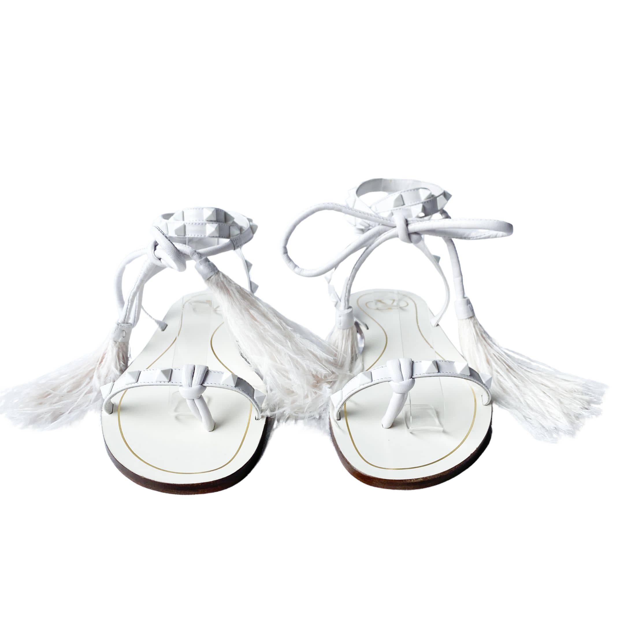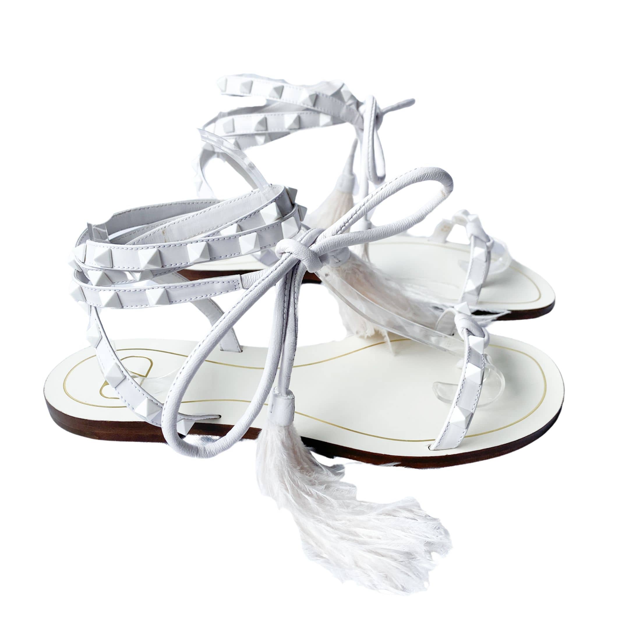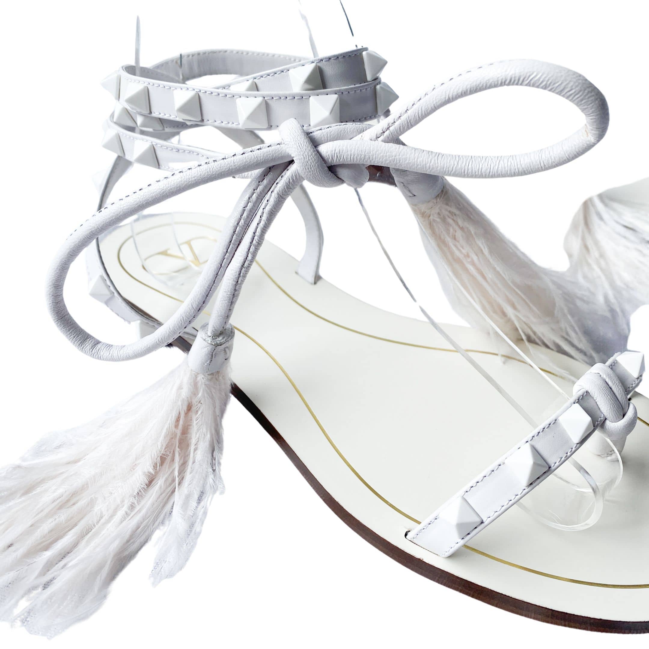 Crafted from premium materials, these sandals feature sleek straps, a comfortable sole, and subtle Valentino Rockstuds and feathers for a polished finish. Designed for versatility, they transition effortlessly from casual daytime looks to chic evening ensembles.