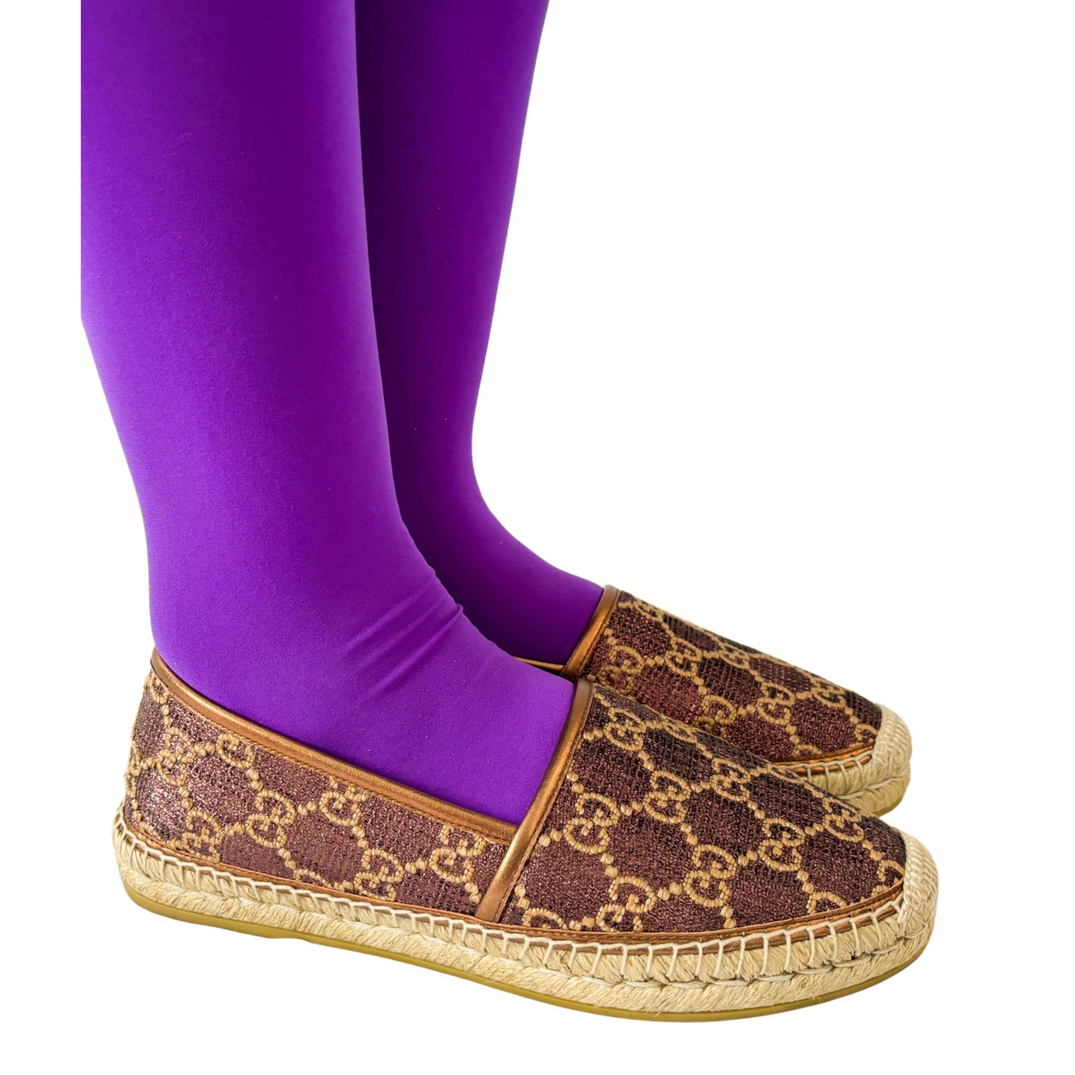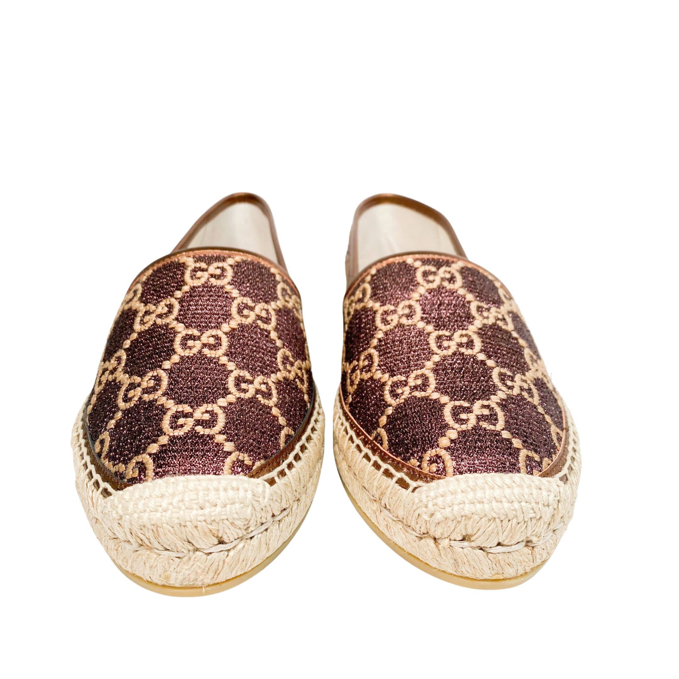 The Gucci GG Heritage Lamé Espadrille is a radiant expression of effortless luxury. Handcrafted in Italy, it features Gucci’s classic GG monogram woven with shimmering lamé threads, creating a subtle metallic sheen that elevates any look.