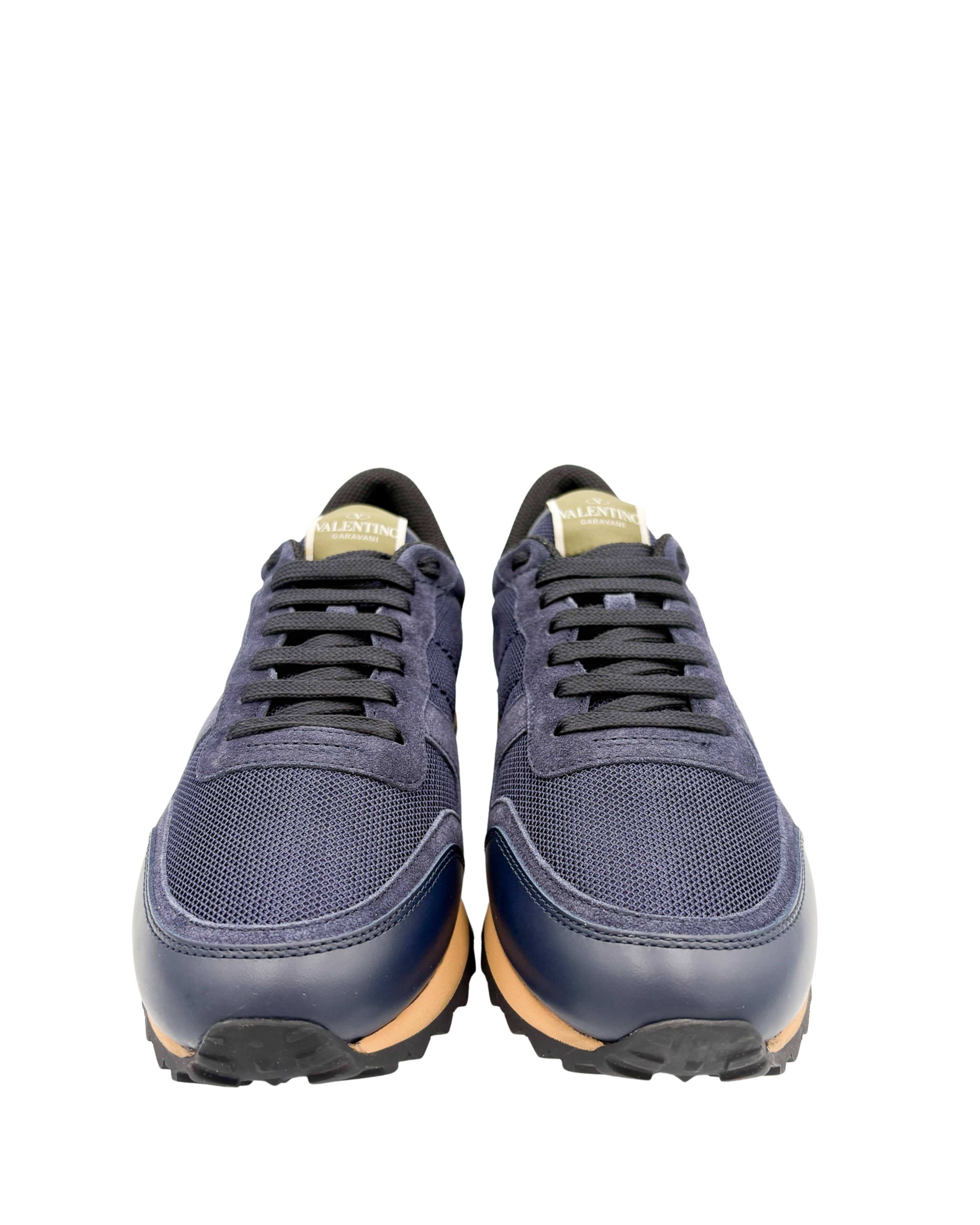 Sport-inspired design meets signature Valentino edge in the Rockrunner Mesh Trainers in Night and Marine. This modern icon combines breathable mesh panels with smooth leather and suede accents, creating a dynamic contrast of texture and tone.
